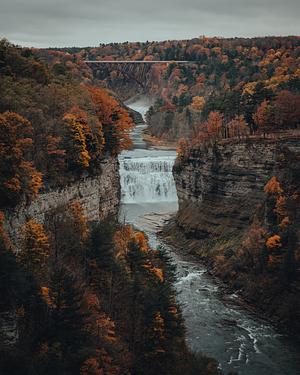 A view of Middle and Uppers Falls from Inspiration Point at Letchworth State Park in New York